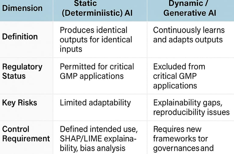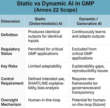Annex 22's scope reflects deliberate regulatory caution, rooted in today's technological realities. Static AI models—those that produce identical outputs for identical inputs—receive regulatory approval for critical GMP applications. Dynamic models, generative AI, and large language models remain explicitly excluded from processes directly impacting patient safety, product quality, or data integrity. This boundary acknowledges fundamental limitations: explainability gaps, reproducibility challenges, and the inability to guarantee consistent outputs that GMP demands.